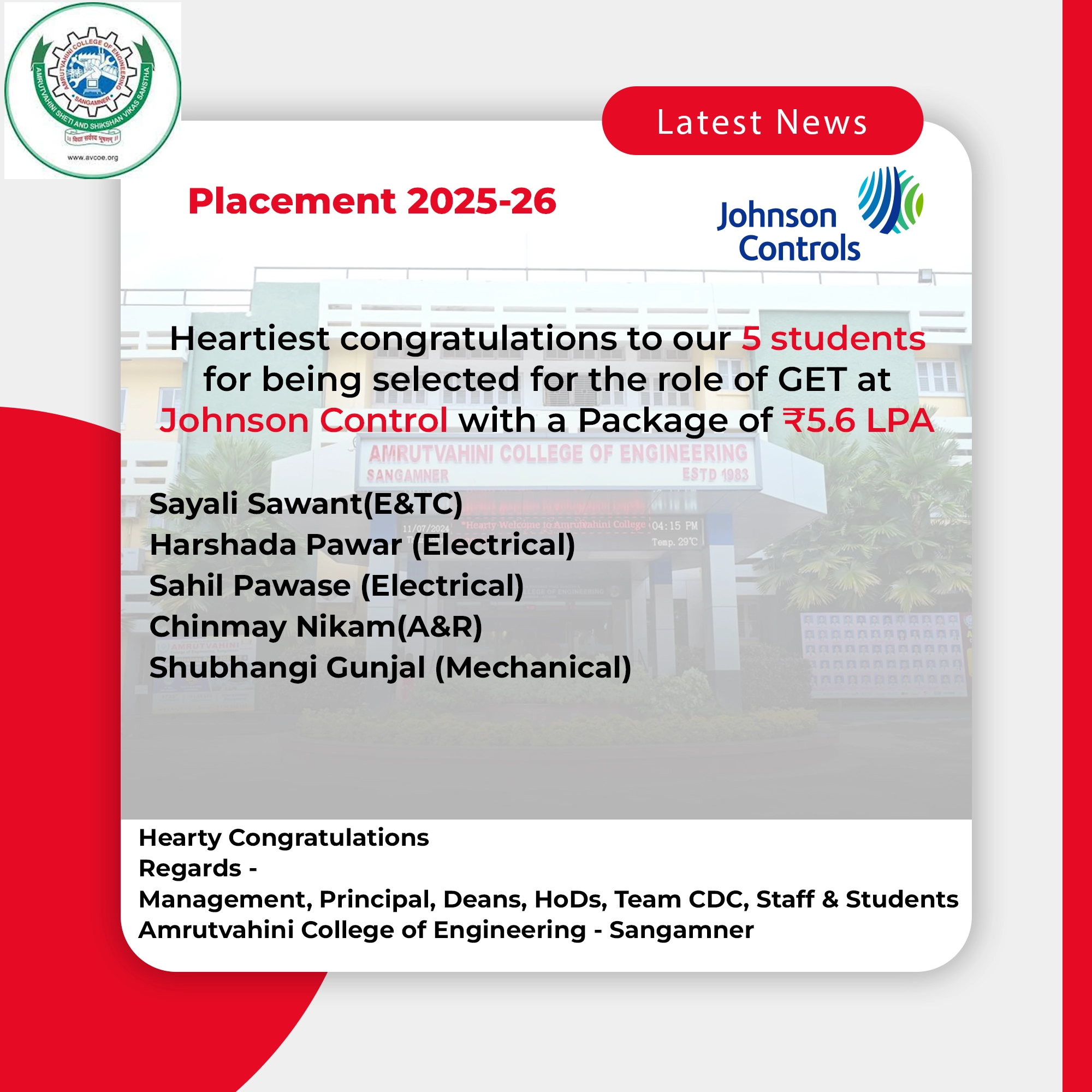 Amrutvahini College of Engineering (AVCOE), Sangamner established in 1983 under the leadership of Hon. Late. Bhausaheb Thorat and progessing under the guidance of Hon. Shri. Balasaheb Thorat, Ex-Revenue Minister,Government of Maharashtra and Hon. Dr.Sudhir Tambe (Ex-MLC Nashik). It is spread over 15.6 acres of ample greenery, with four times accreditation by NBA, New Delhi, Graded 'A+' by NACC Government of India and Educational Organization Management System(EOMS)in accordance with ISO 21001:2018. It boasts state of art IT centre with 500 MBPs Leased Line and 300 MBPs Broadband Internet Facility. It has a huge library that accommodates 69,309 books,44000+ e-Books & 315 e-journals. It provides 100% placement assistance to its students through value added courses,foreign langauges (Japanese , German) and Training. It is an Institute that has always worked for imparting excellence driven engineering education that builds the future of Engineers and Entrepreneurs.
