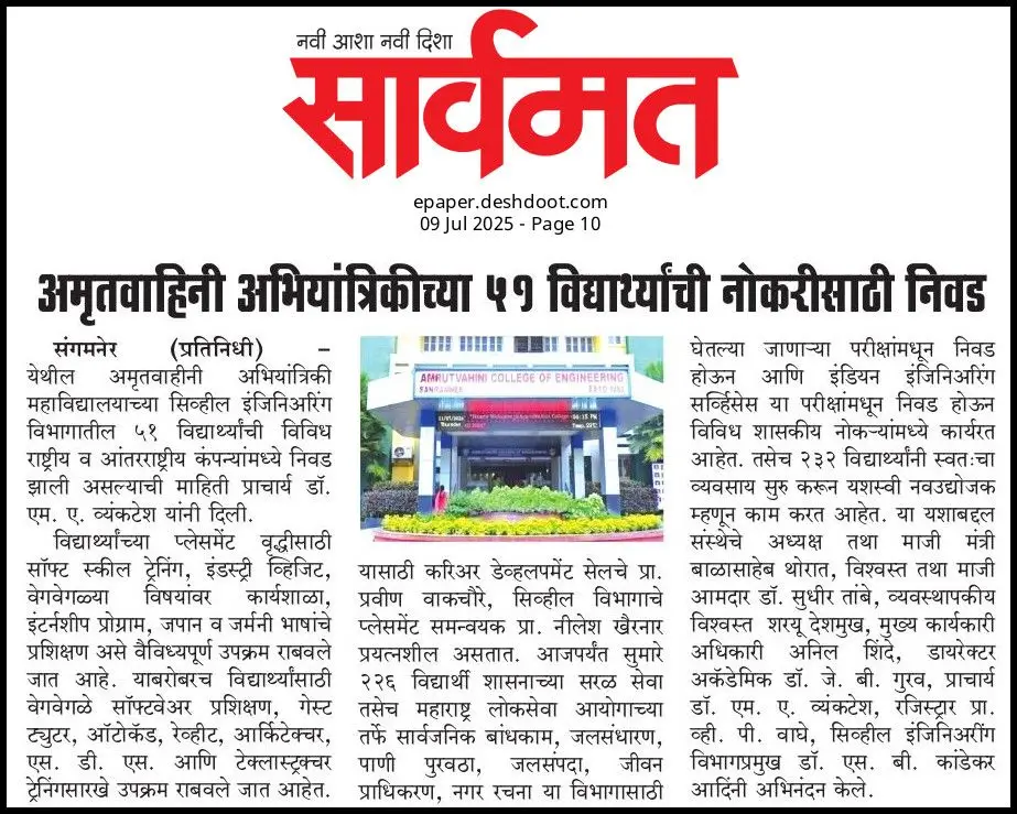 The department involves in various college activities like annual social gathering and sports. Every year department is organizing technical events like TechnoAmrut, which gives platform to the students to develop technocrat skills. Department has focused on making the students competent enough to get placed in well reputed companies like AFCON Infrastructures,HCC,IVRCL Hyderabad , Godrej Infrastructures, Dorche India, MagarpattaCity Pune, Jacobs Engineering, Gayatri Construction,Techflow Engineers, Protious Engineering Service Ltd, Make My House etc.
